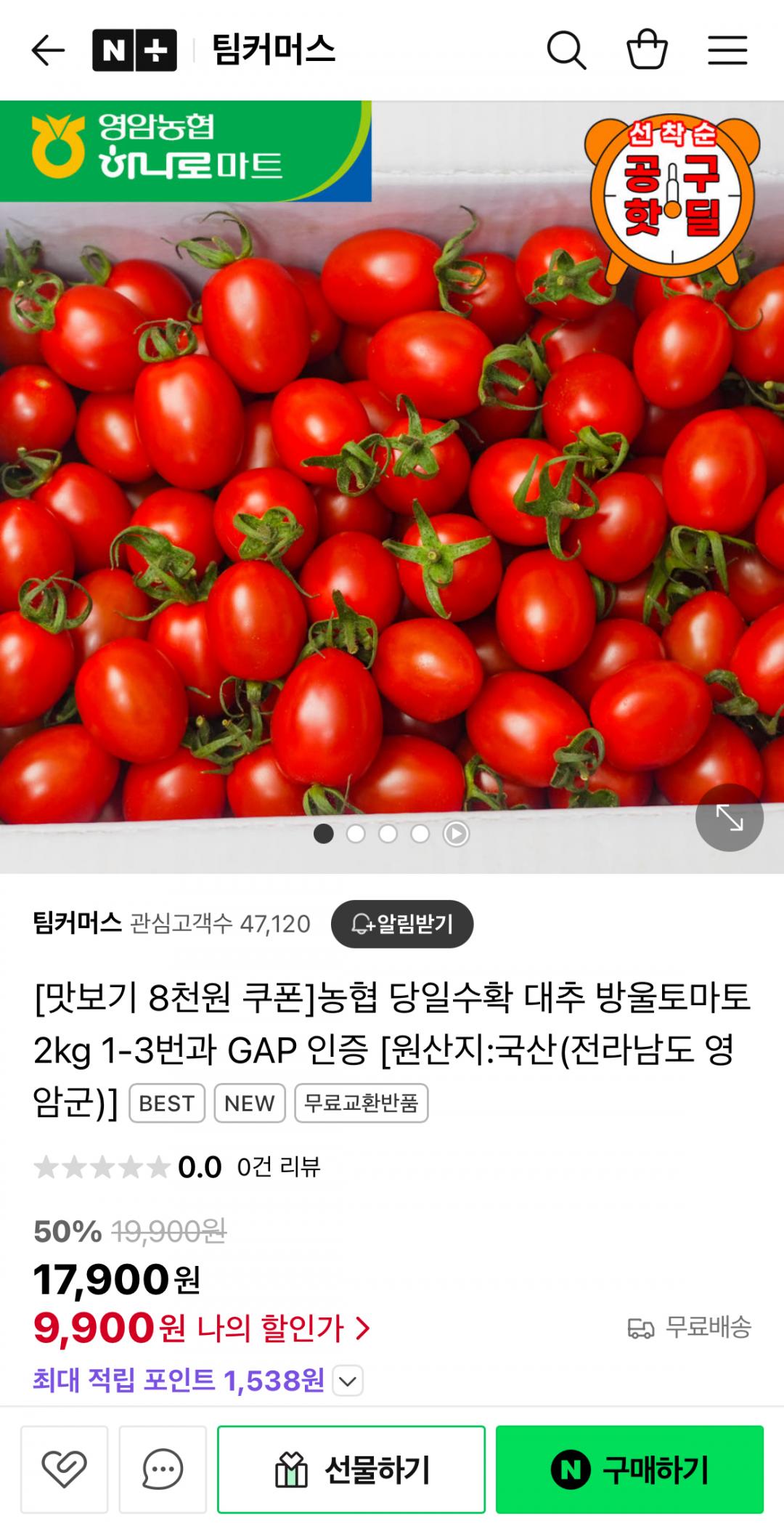 [네이버] 농협 당일수확 대추 방울토마토 2kg (9,900원/무료)