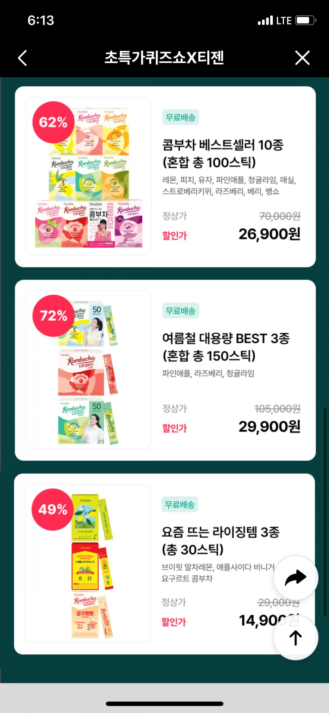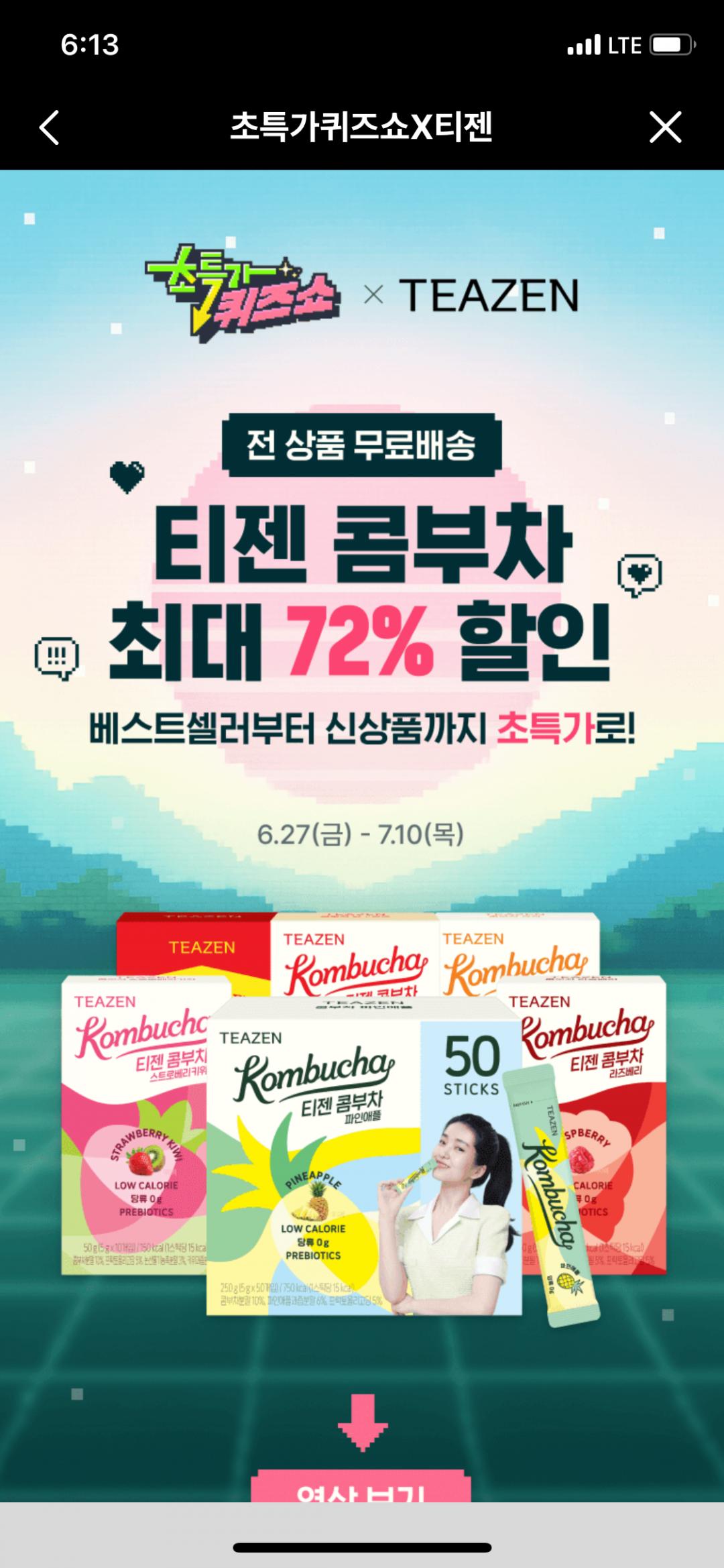 유튜브 <초특가퀴즈쇼>에서 본 티젠 콤부차 특가 소개입니다