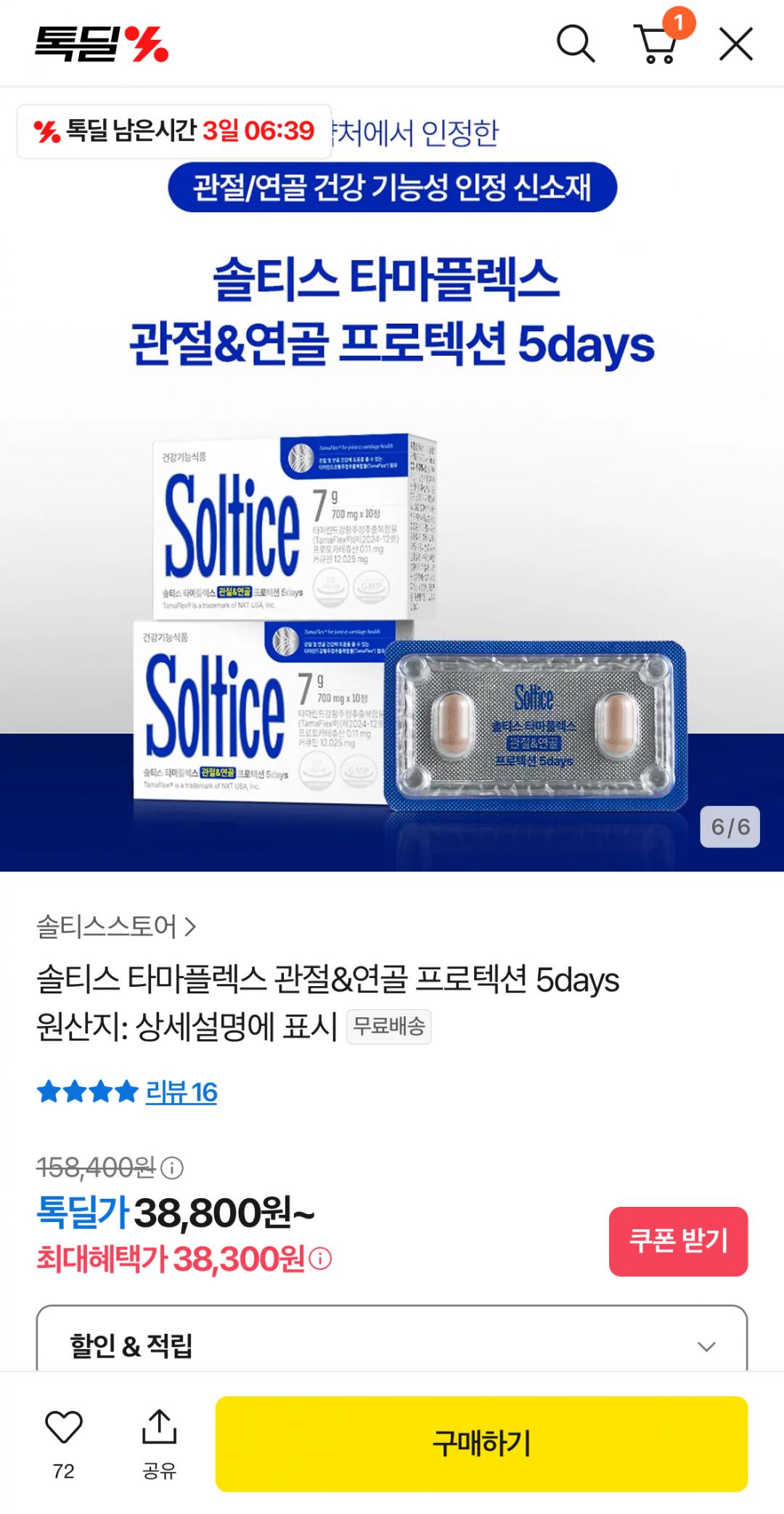 [카카오톡딜] 솔티스 타마플렉스 관절영양제 2박스 (38,800원/무료배송) > 국내핫딜