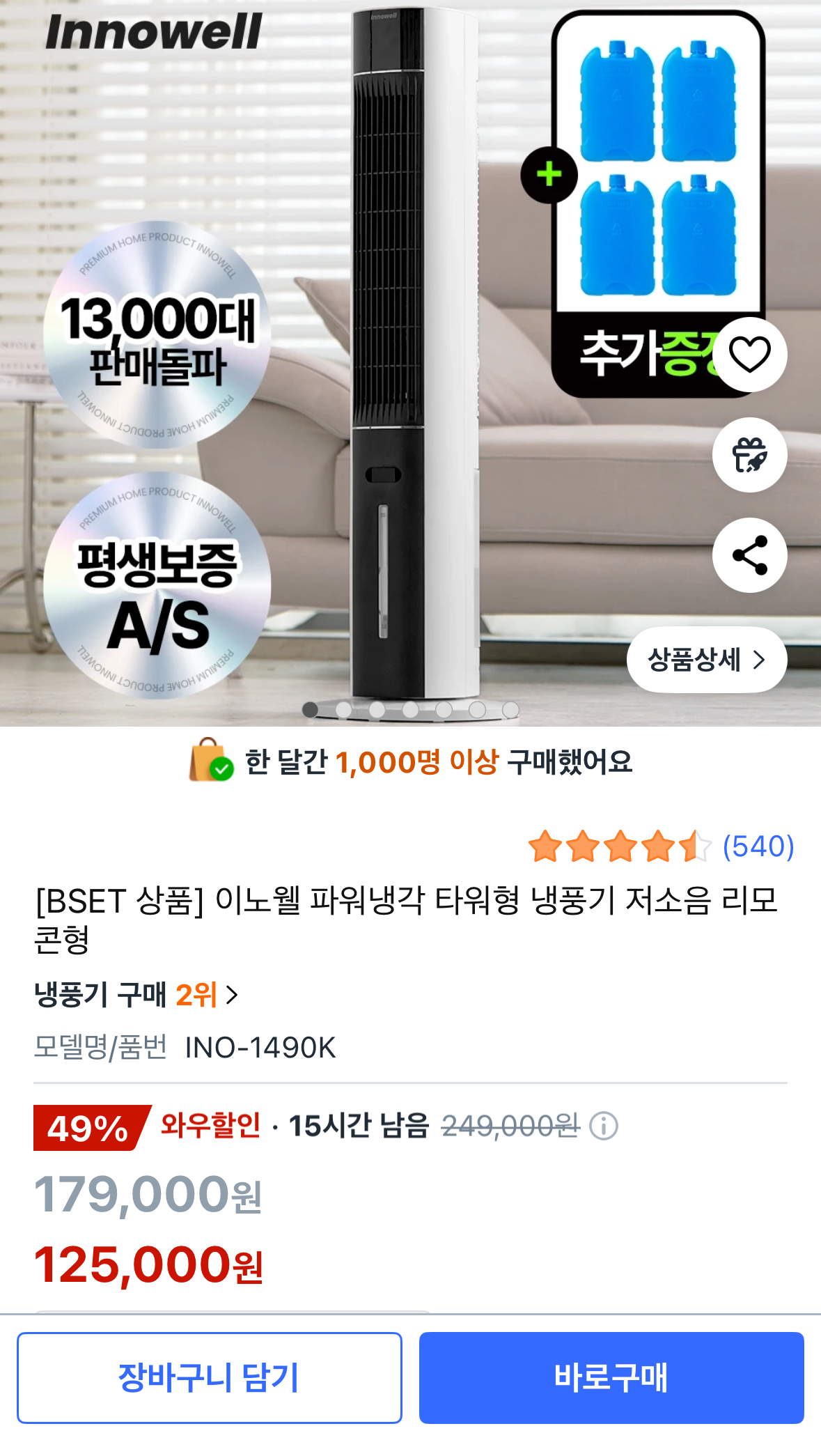 [쿠팡] 이노웰 타워형 냉풍기 (125,000원/무료배송)