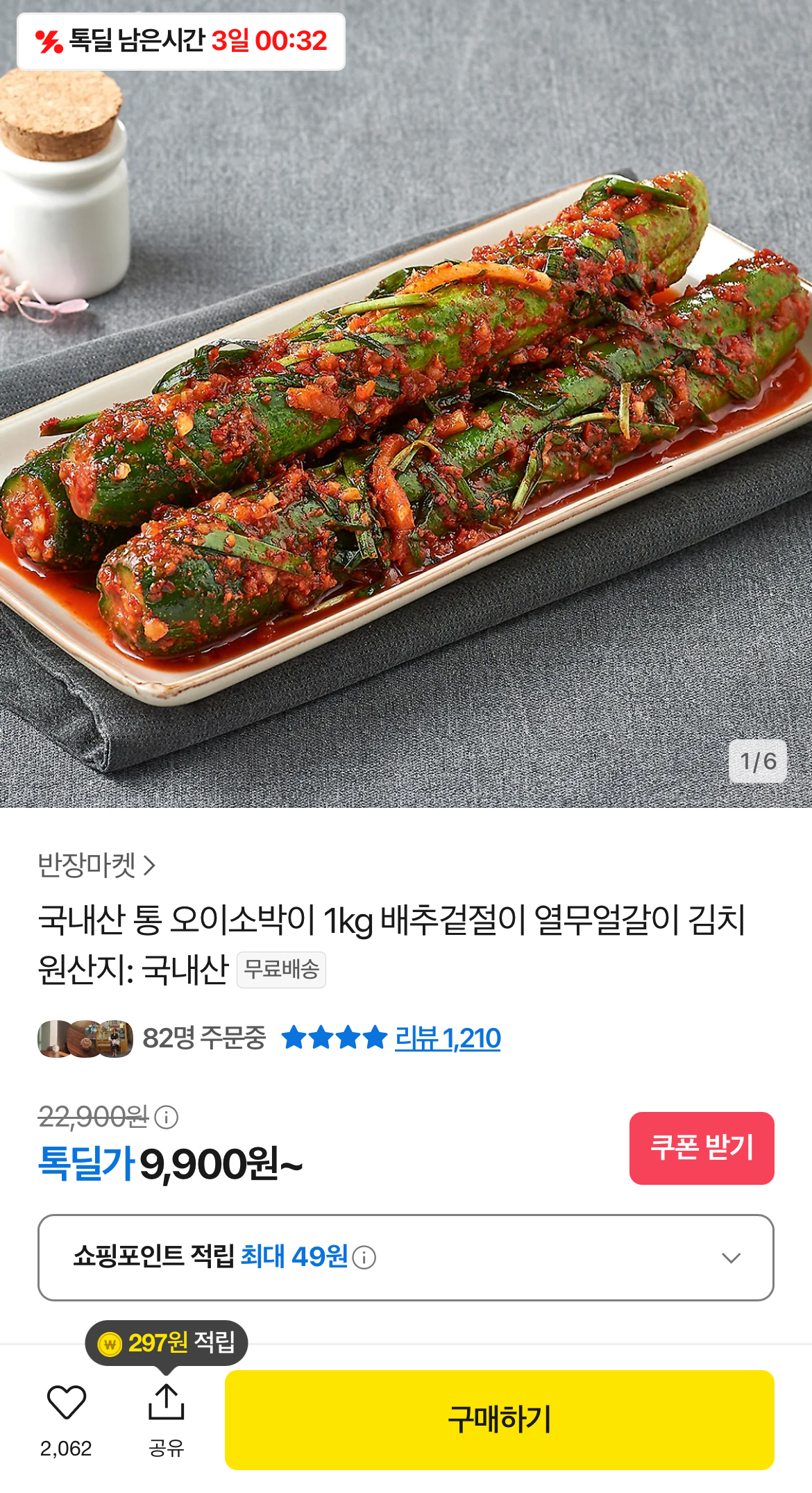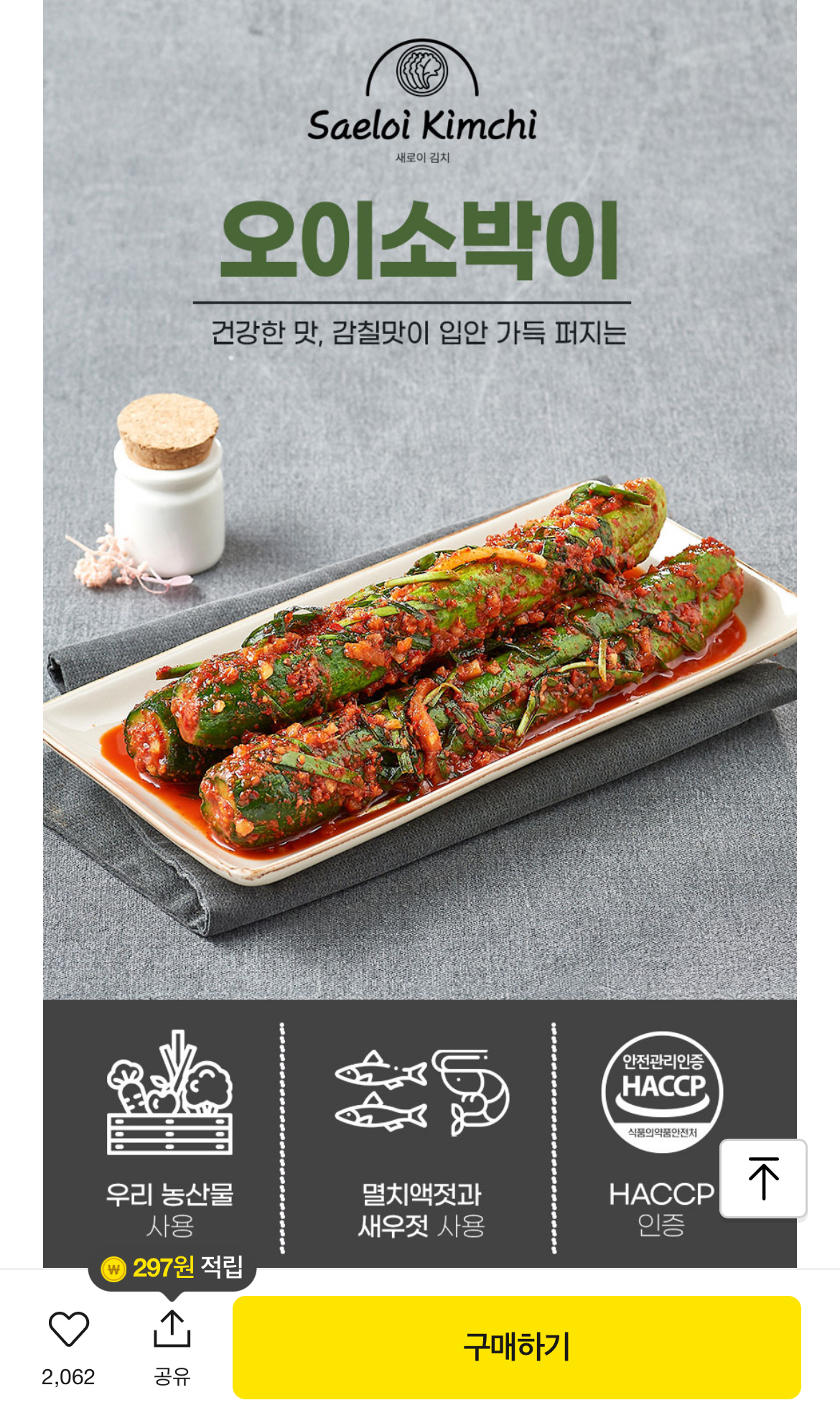 [톡딜] 국내산 통 오이소박이 1kg (9,900원/무료)