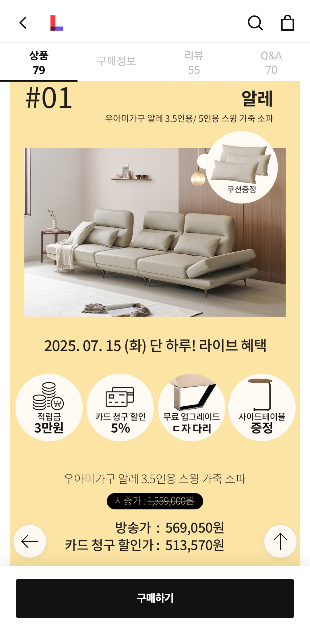 [롯데홈쇼핑] 우아미가구 알레 3.5인용 스윙 가죽 소파 (513,570원/유배) > 국내핫딜