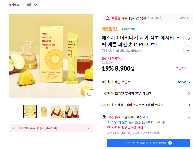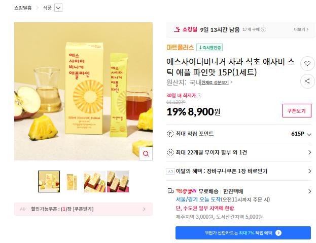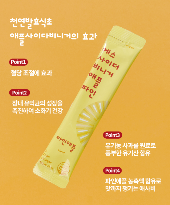 11번가)에스사이더비니거 사과식초 애사비 스틱 애플 파인맛 15P 8,900원 > 국내핫딜