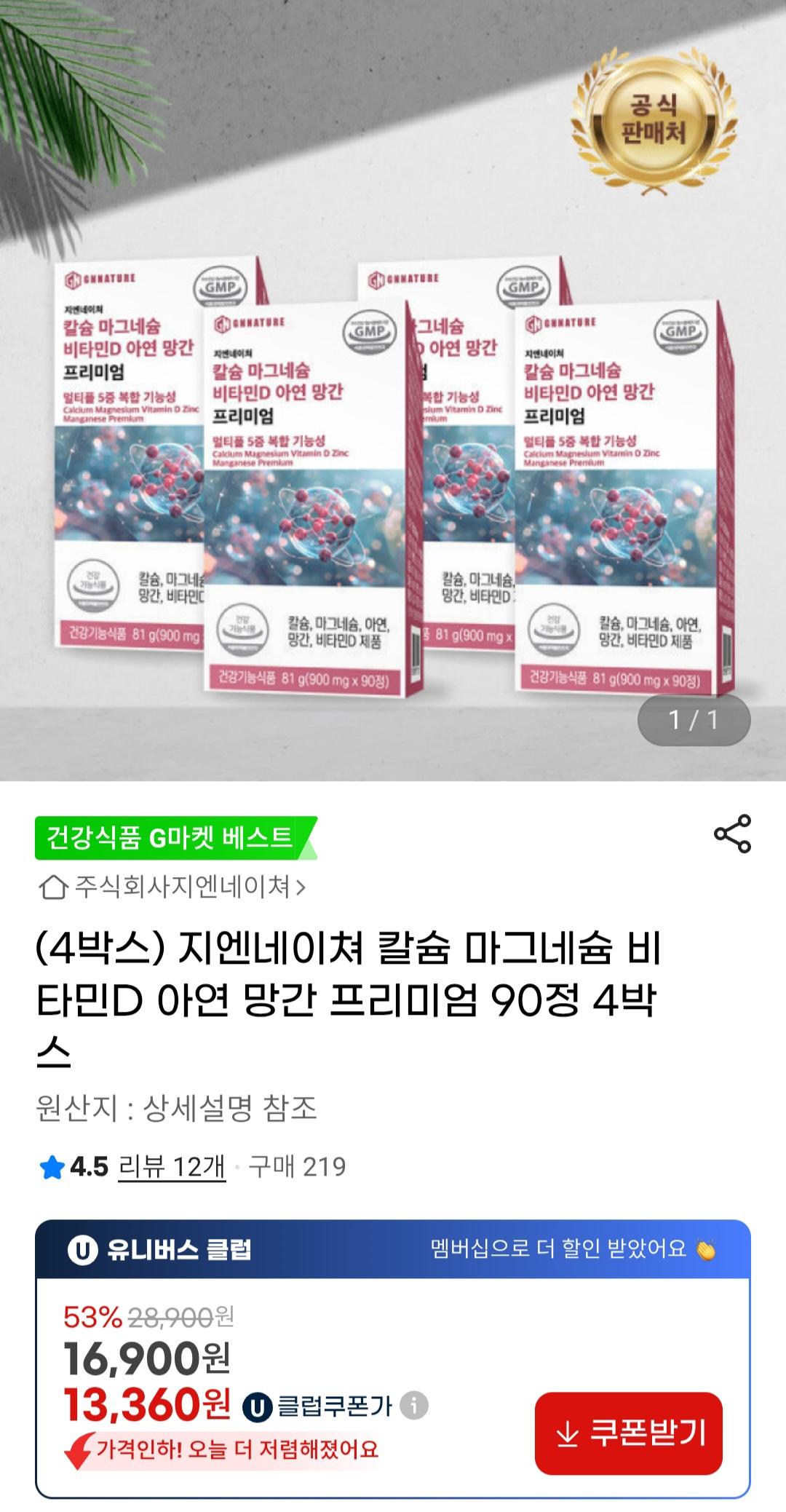 [지마켓]지엔네이쳐 칼슘 마그네슘 비타민D 아연 망간 프리미엄 90정 4박스 (유클13,360원/무료) > 국내핫딜