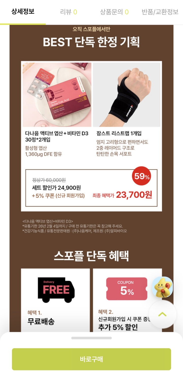 잠스트 손목보호대 구성 할인 크게하네요 엽산 영양제 증정이라 품절될까봐 바로 샀습니다  한정기획이라 가격 엄청 괜찮아요!