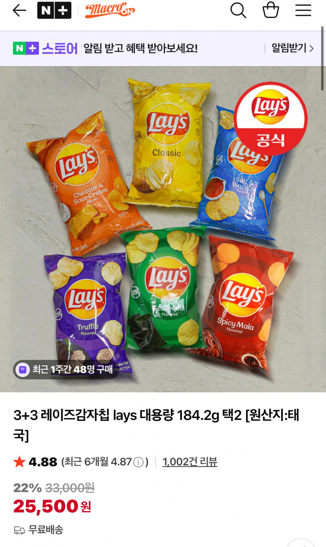 [네이버] 3+3 레이즈감자칩 lays 대용량 184.2g (25,500원/무배)