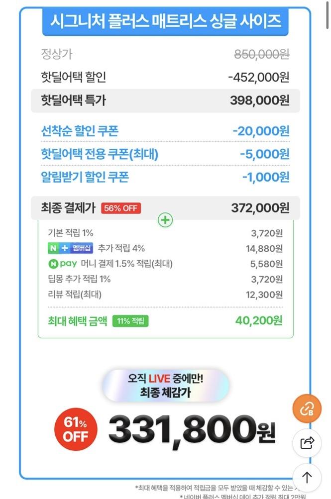 [네이버] 허리에 좋은 매트리스 61% 할인폭 크네요 ( 331,800원/무배) > 국내핫딜