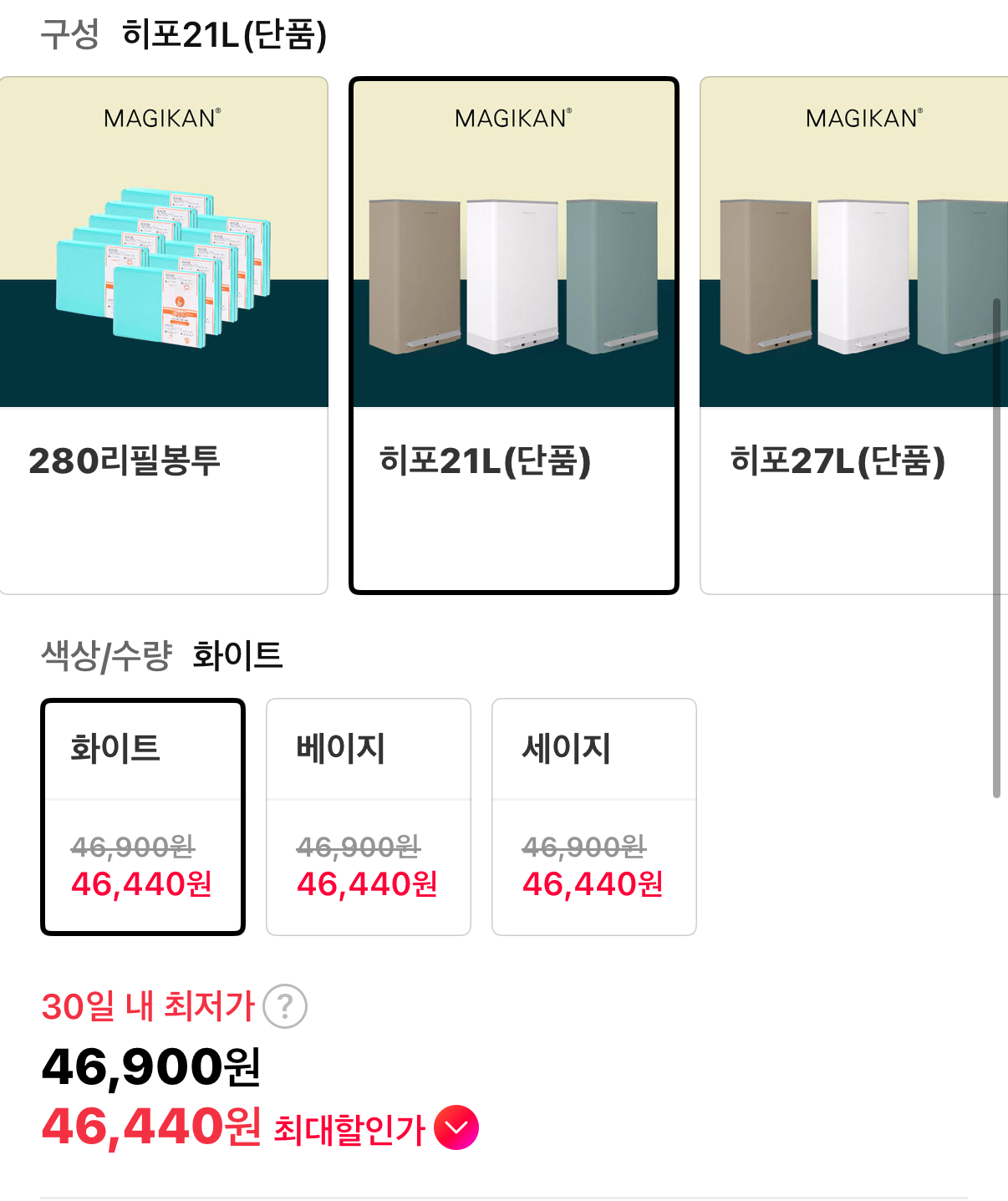 매직캔 히포 21L 46,900원 무배