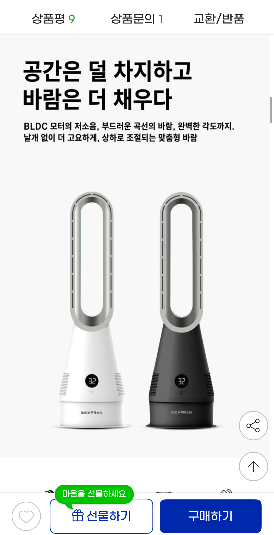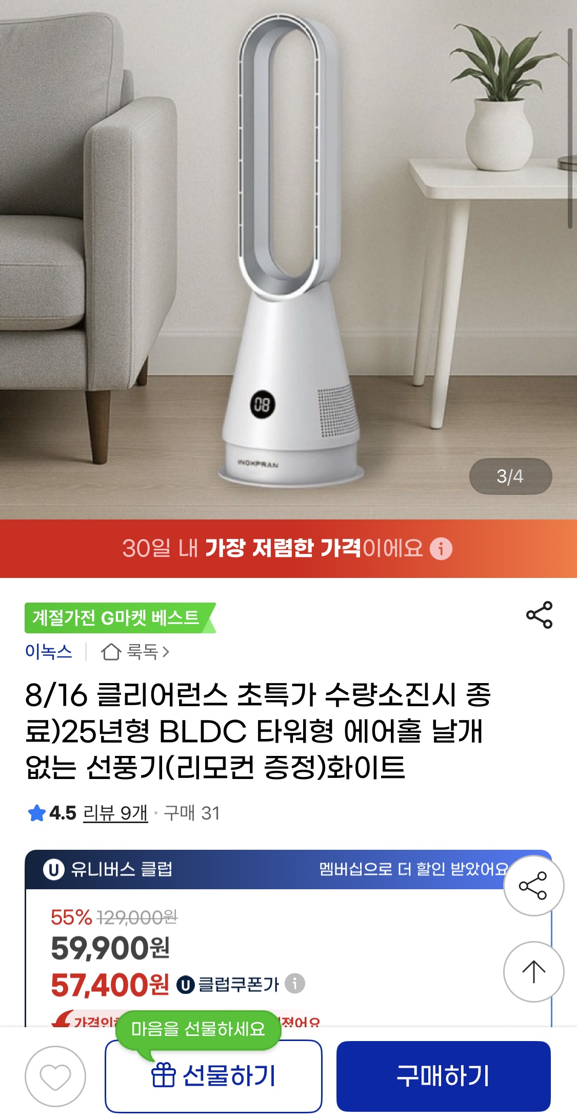 [지마켓] BLDC 타워형 날개 없는 선풍기 화이트 + 리모컨 (59,000원/무배) > 국내핫딜