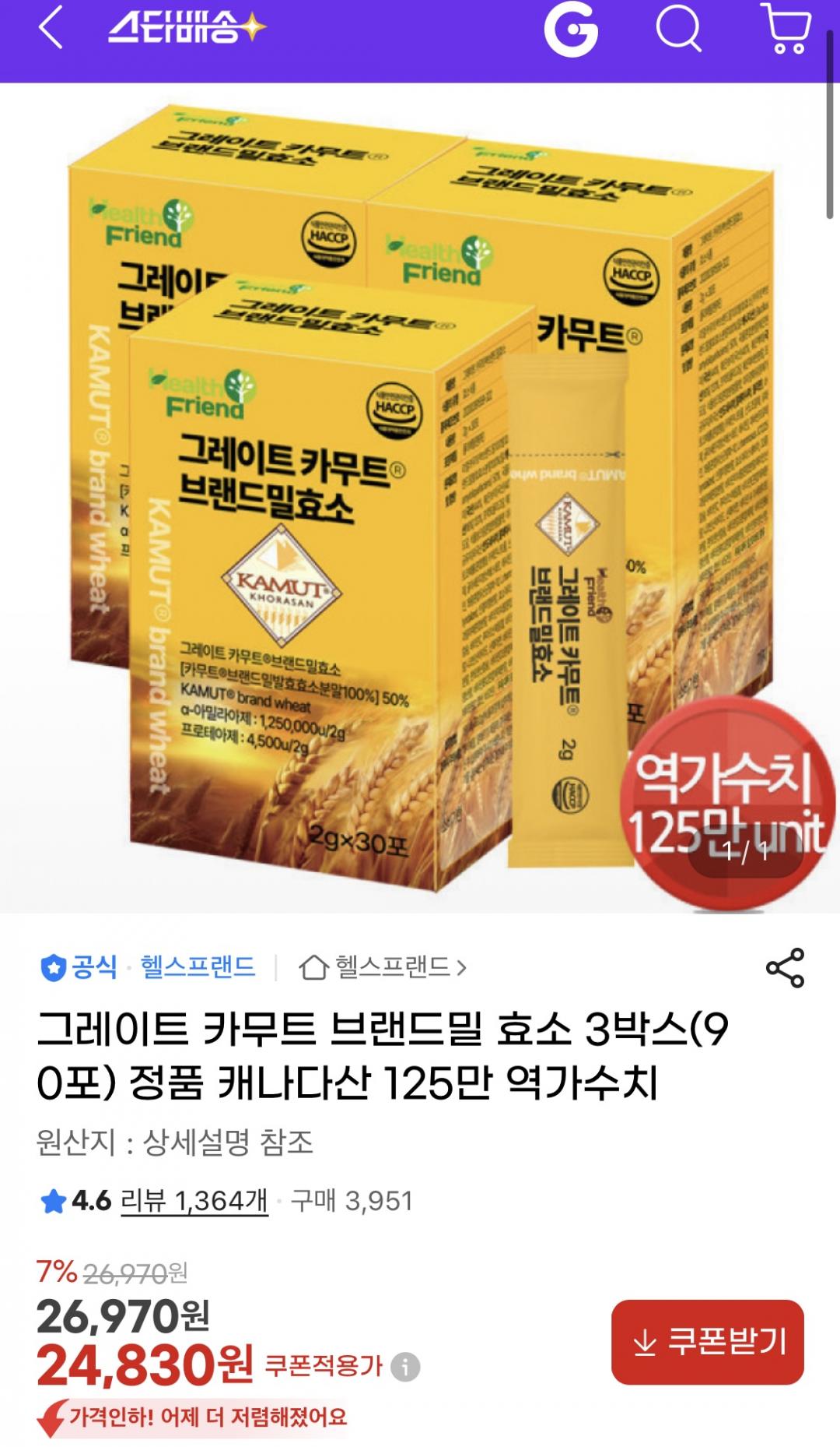 [지마켓] 그레이트 카무트 브랜드밀 효소 30포 x 3박스 (24,830원/무료) > 국내핫딜