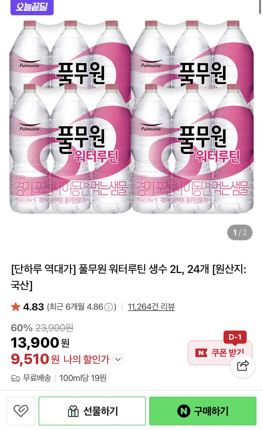 [네이버] 풀무원 워터루틴 2L×24개 (9,510원/무료)