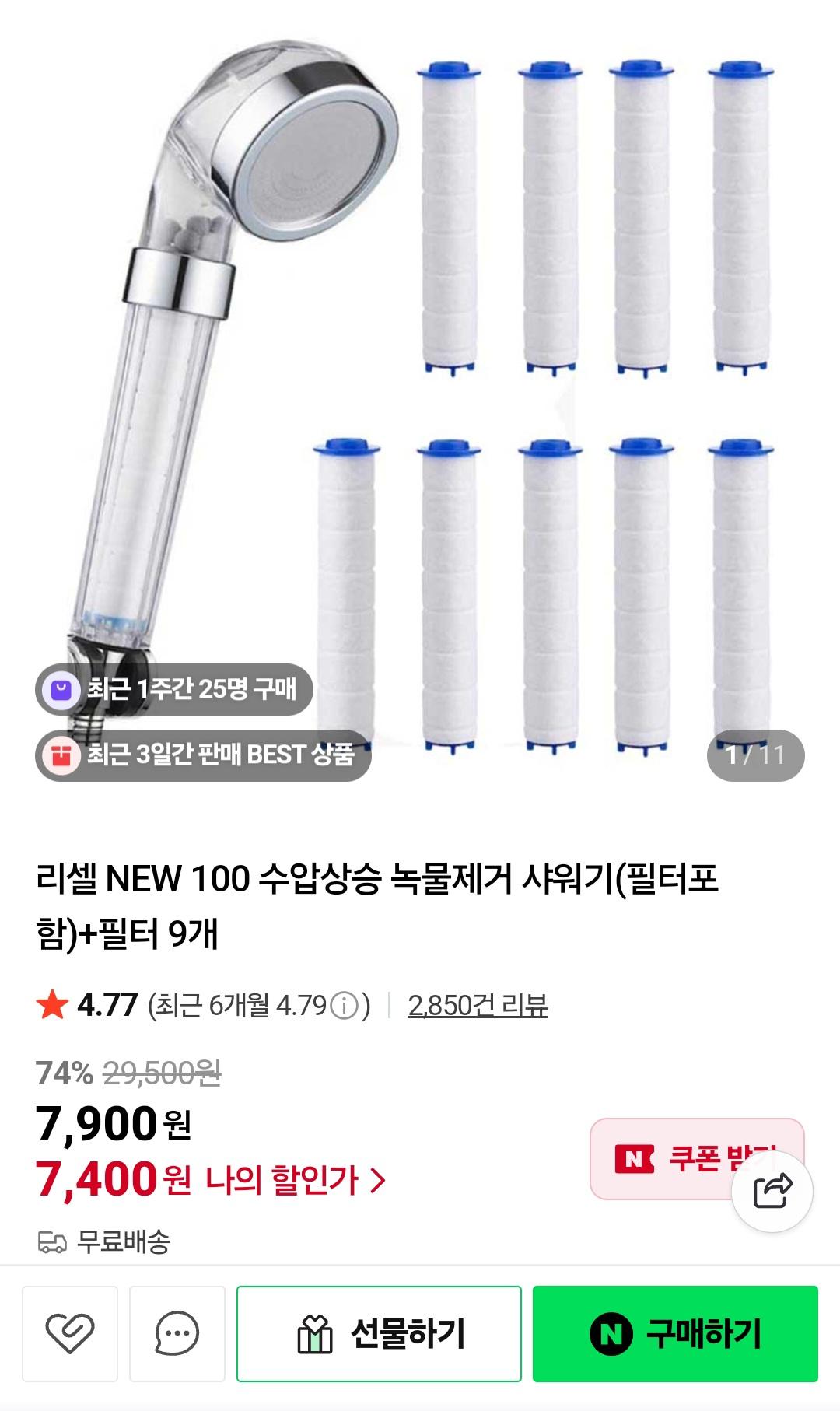 [네이버] 수압상승 샤워기 + 필터 9개 (7,900원/무배)