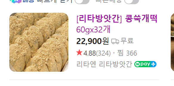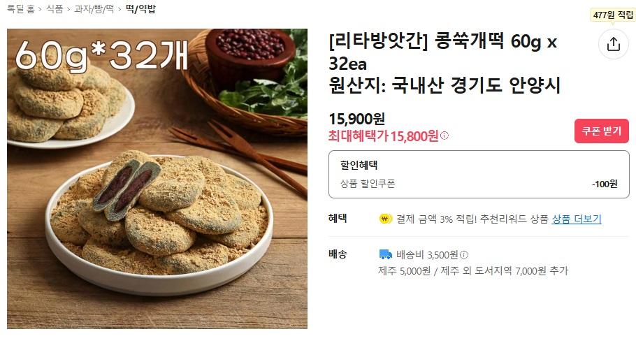 [카카오톡] 추석떡 리타방앗간 콩쑥개떡 60g x 32ea 세트 (15,800원/3,500원) > 국내핫딜