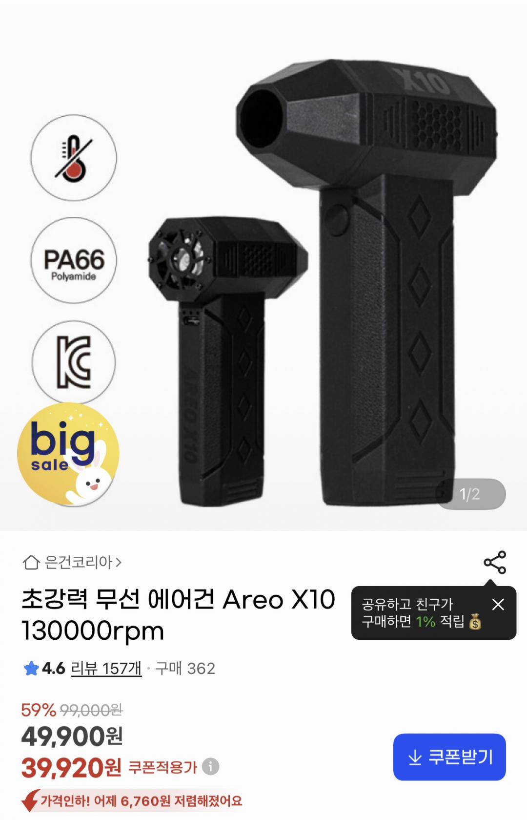 [G마켓] 초강력 무선 에어건 Areo X10 130000rpm (39,920원)