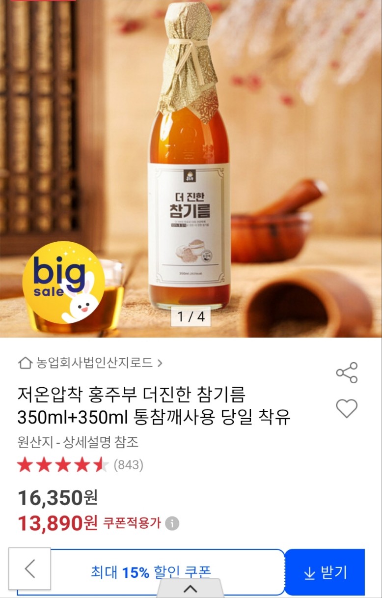 [옥션] 저온압착 홍주부 더진한 참기름 350ml+350ml (13,890원/무료)