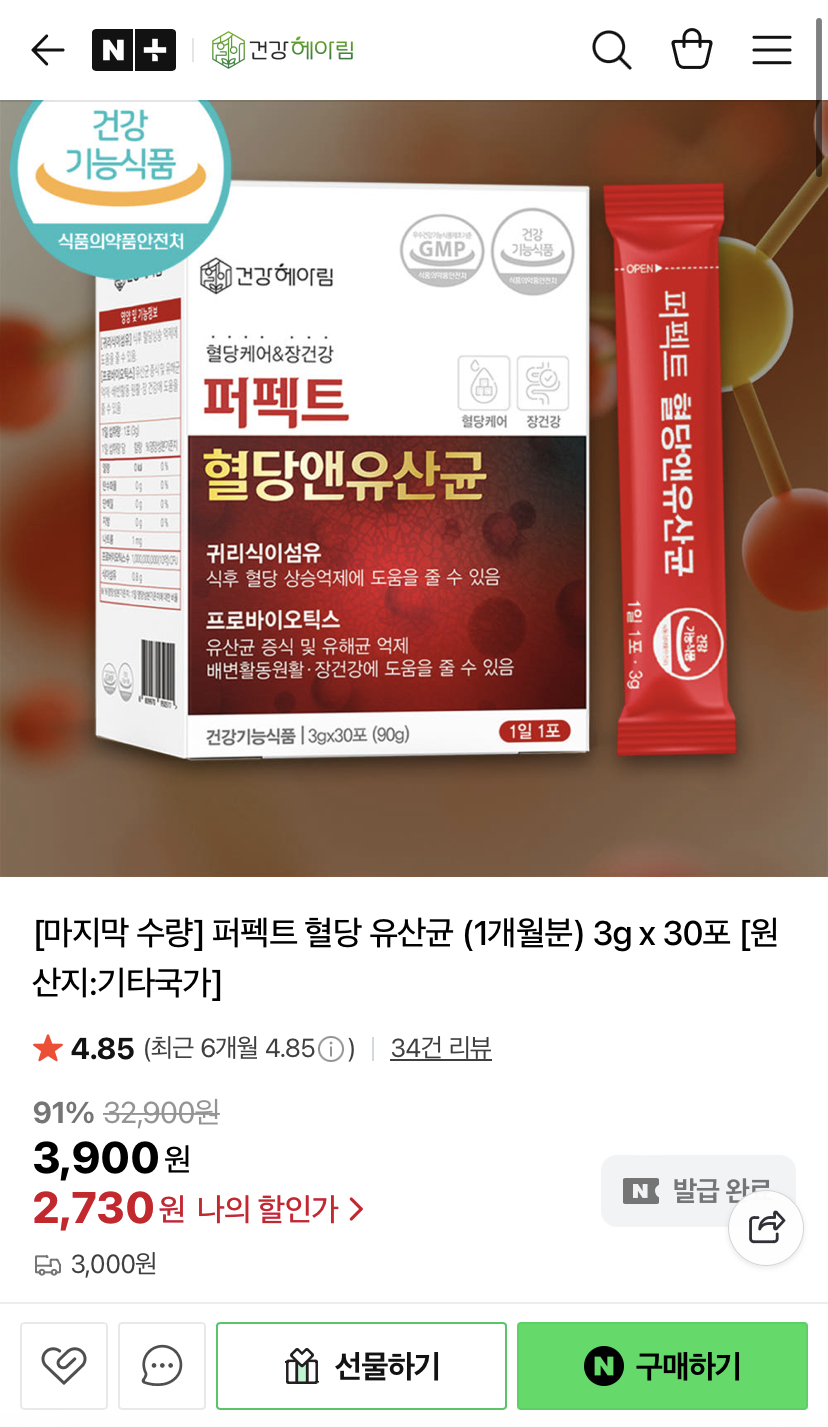 [네이버]퍼펙트 혈당 유산균 (1개월분) 3g x 30포(2,730원/3,000원)