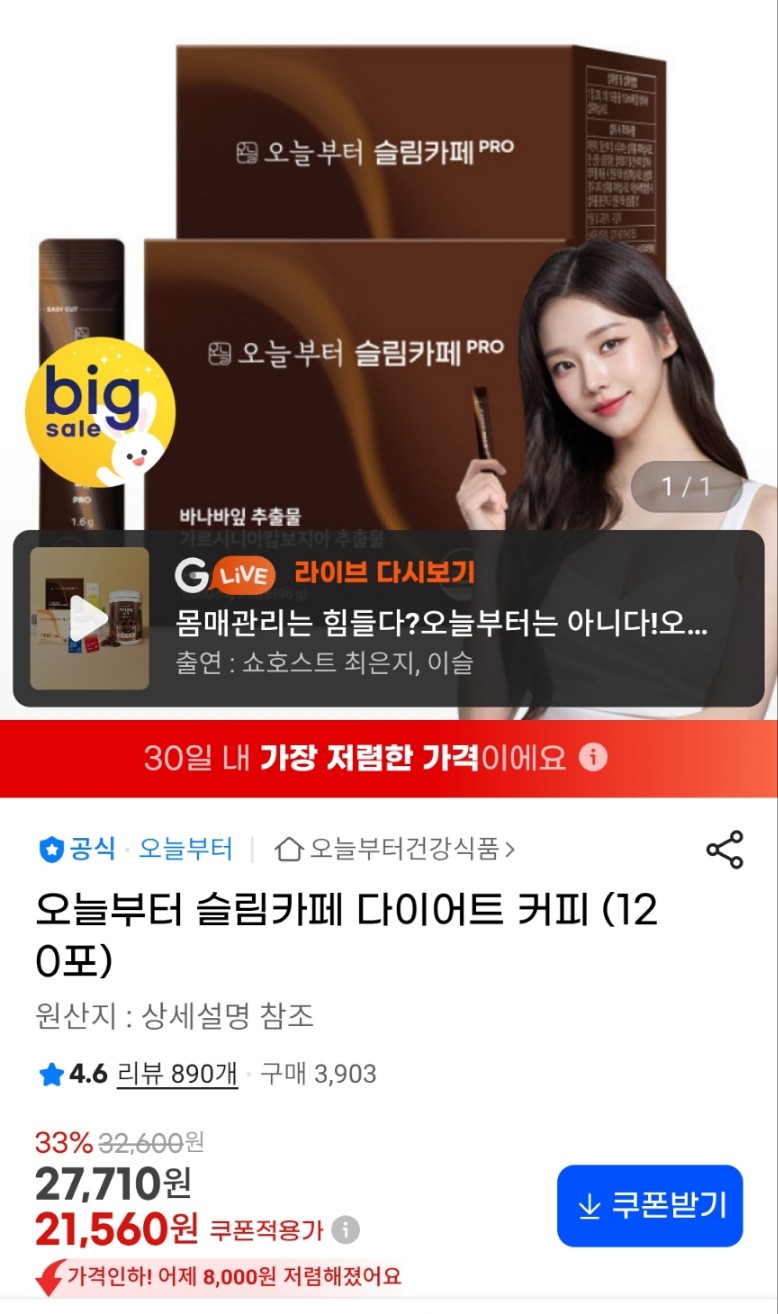[지마켓] 오늘부터 슬림카페 다이어트 커피 (120포) (21,560원/무료)
