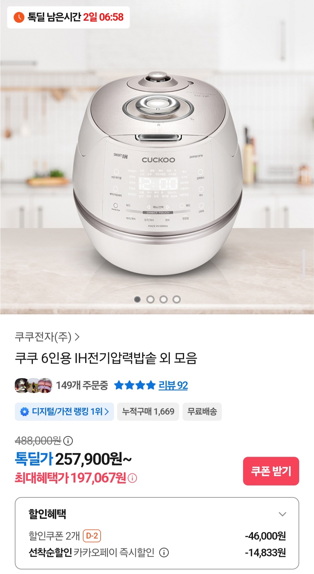 쿠쿠 6인용 IH 밥솥 19만원대 할인