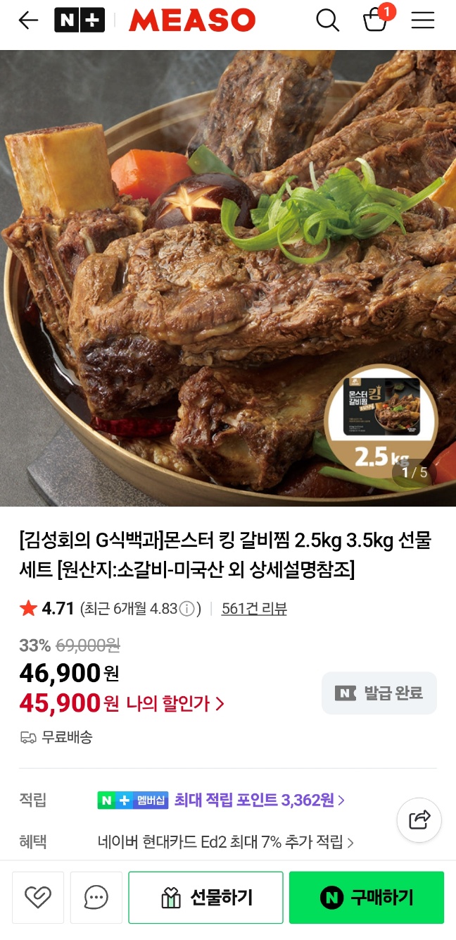 [네이버] 미소 몬스터 킹 갈비찜 오리지널 2.5kg (41,210원/무배)