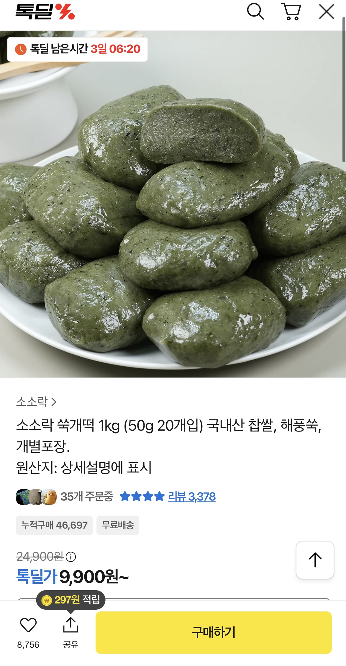톡딜)소소락 국내산 쑥개떡 1KG 50G*20개입 9,900원/무배