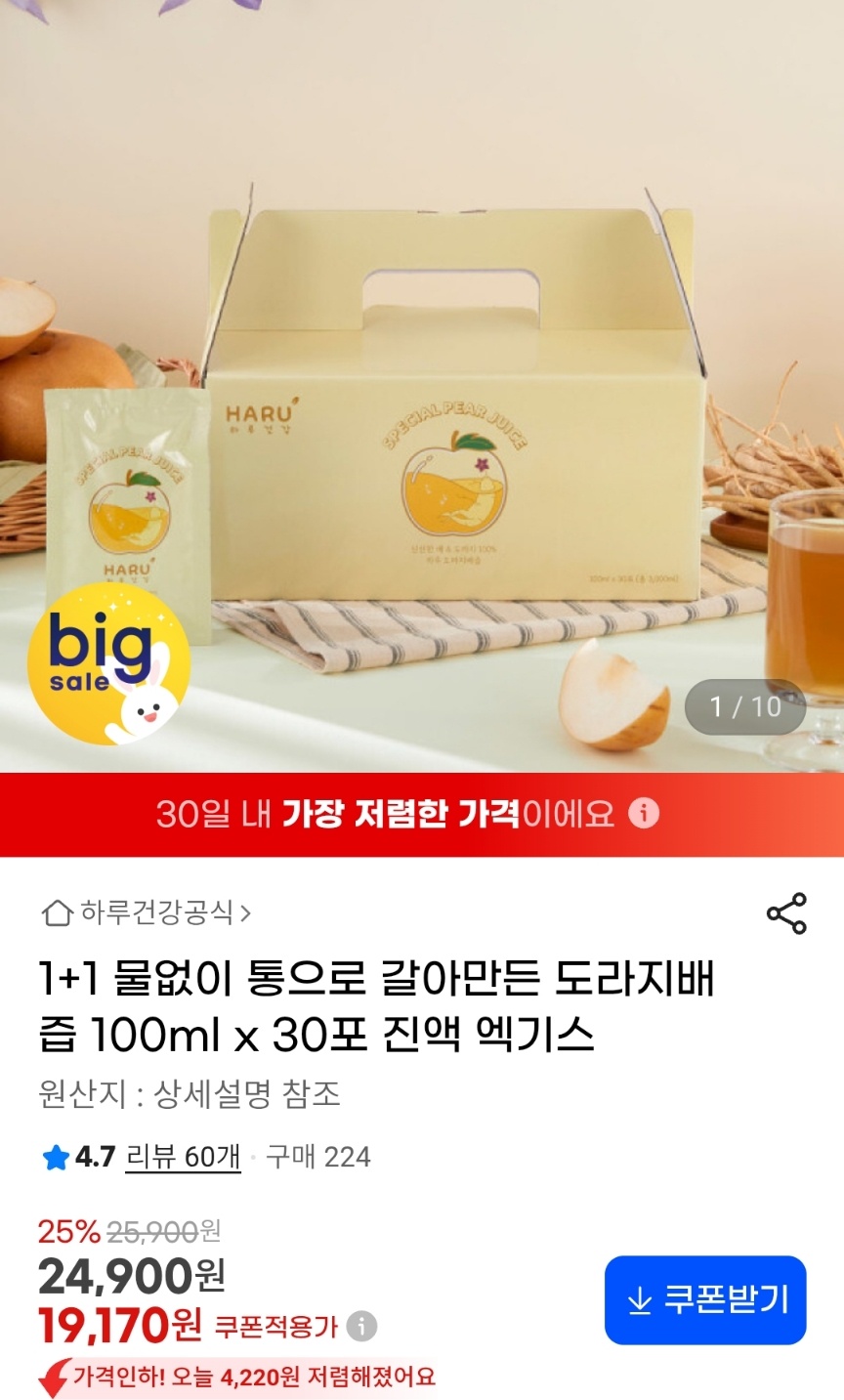 [지마켓] 1+1 물없이 통으로 갈아만든 도라지배즙 총 60포 (19,170원/무료)