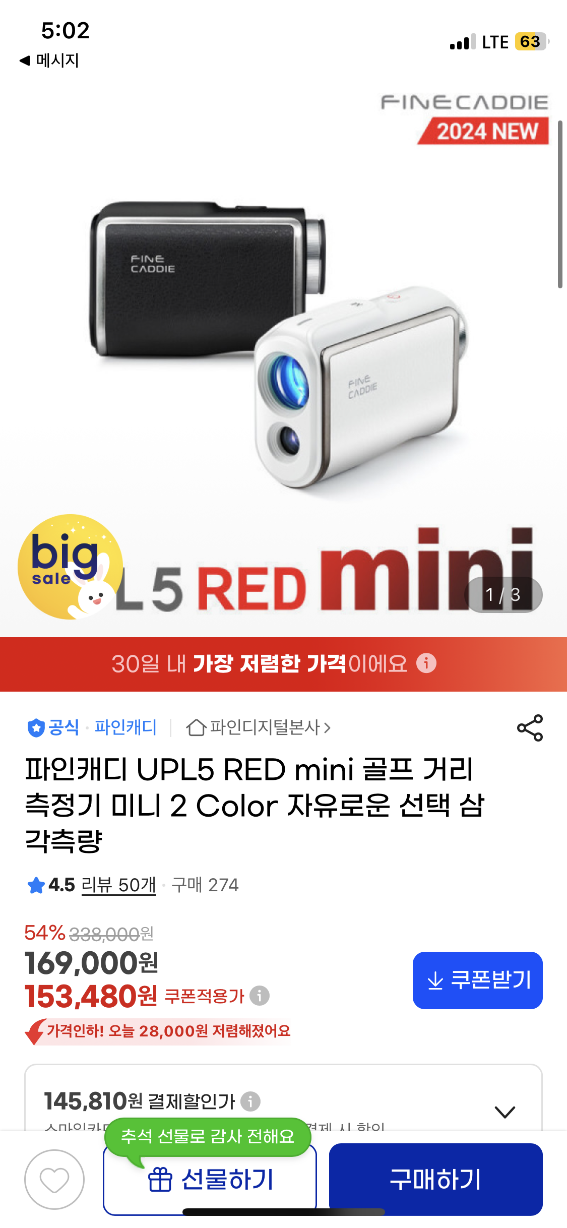 G마켓) 파인캐디 골프 거리측정기 UPL5 RED mini 카드할인가 145,810원 무배