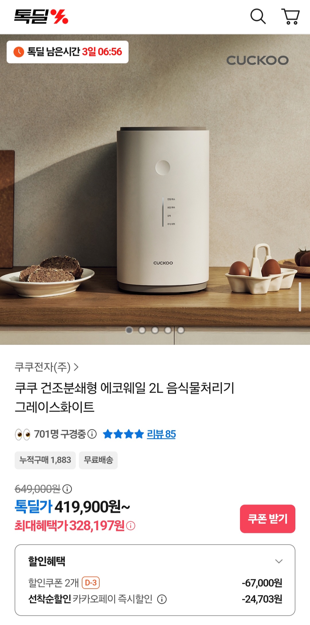 [카카오] 쿠쿠 강력분쇄 에코웨일 음식물처리기 (328,197원/무배)