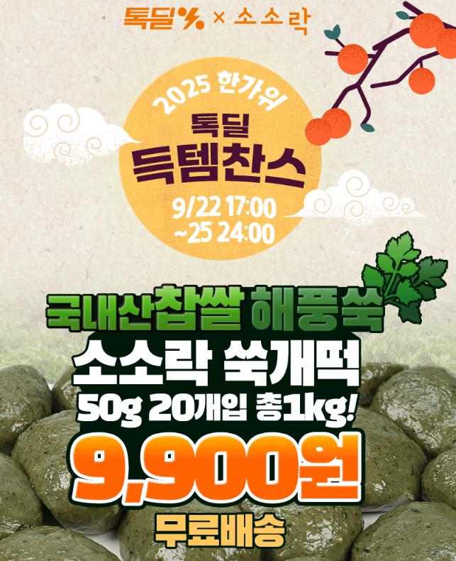 톡딜)소소락 국내산 쑥개떡 1KG 50G*20개입 9,900원/무배 > 국내핫딜