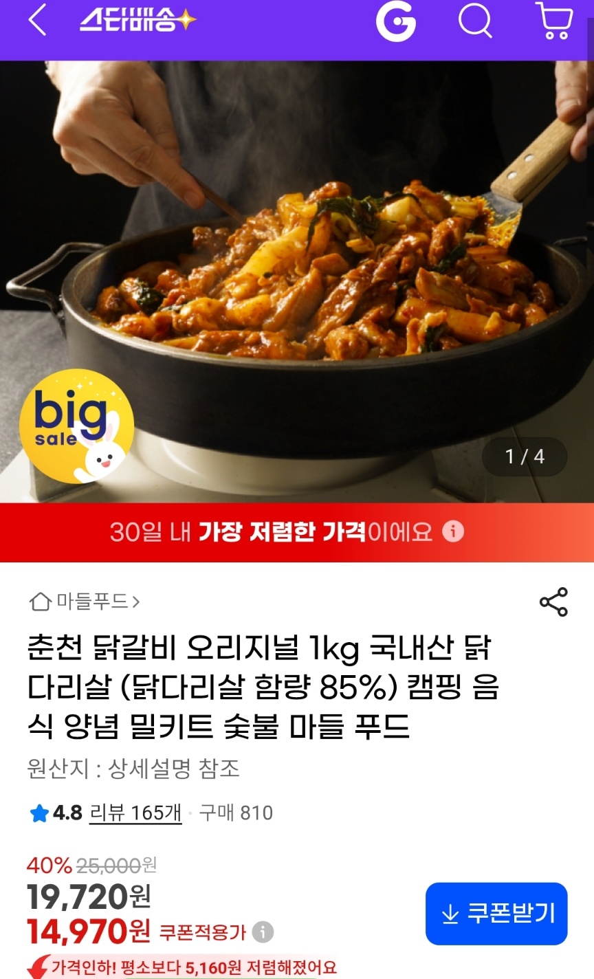 [지마켓] 춘천 닭갈비 1kg 국내산 닭다리살 (14,970원/무료)