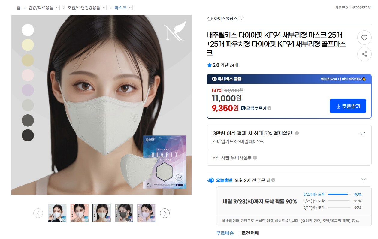 [지마켓] 내추럴키스 다이아핏 KF94 새부리형 마스크 25매+25매 파우치형 (9,350원/무배)
