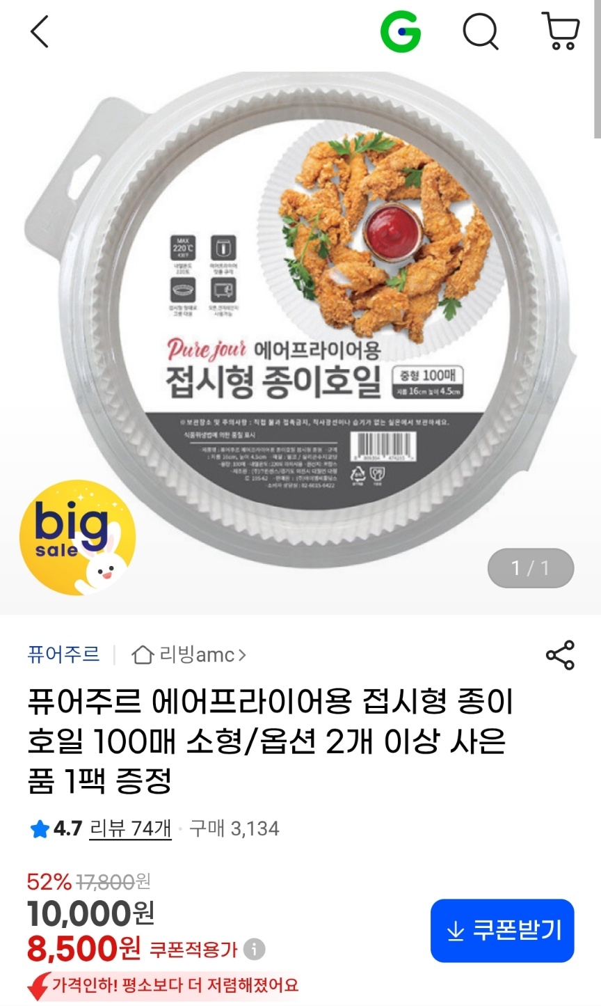 [지마켓] 퓨어주르 에어프라이어용 접시형 종이호일 100매 소형 (8,500원/무료)