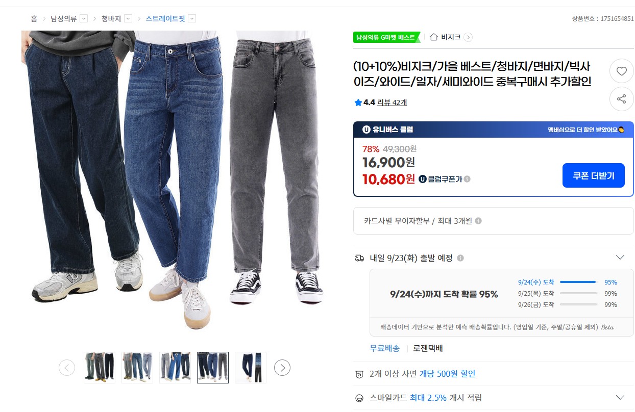 [지마켓] 비지크 남자 청바지/와이드/반바지/일자/세미와이드 (11,520원/무배)