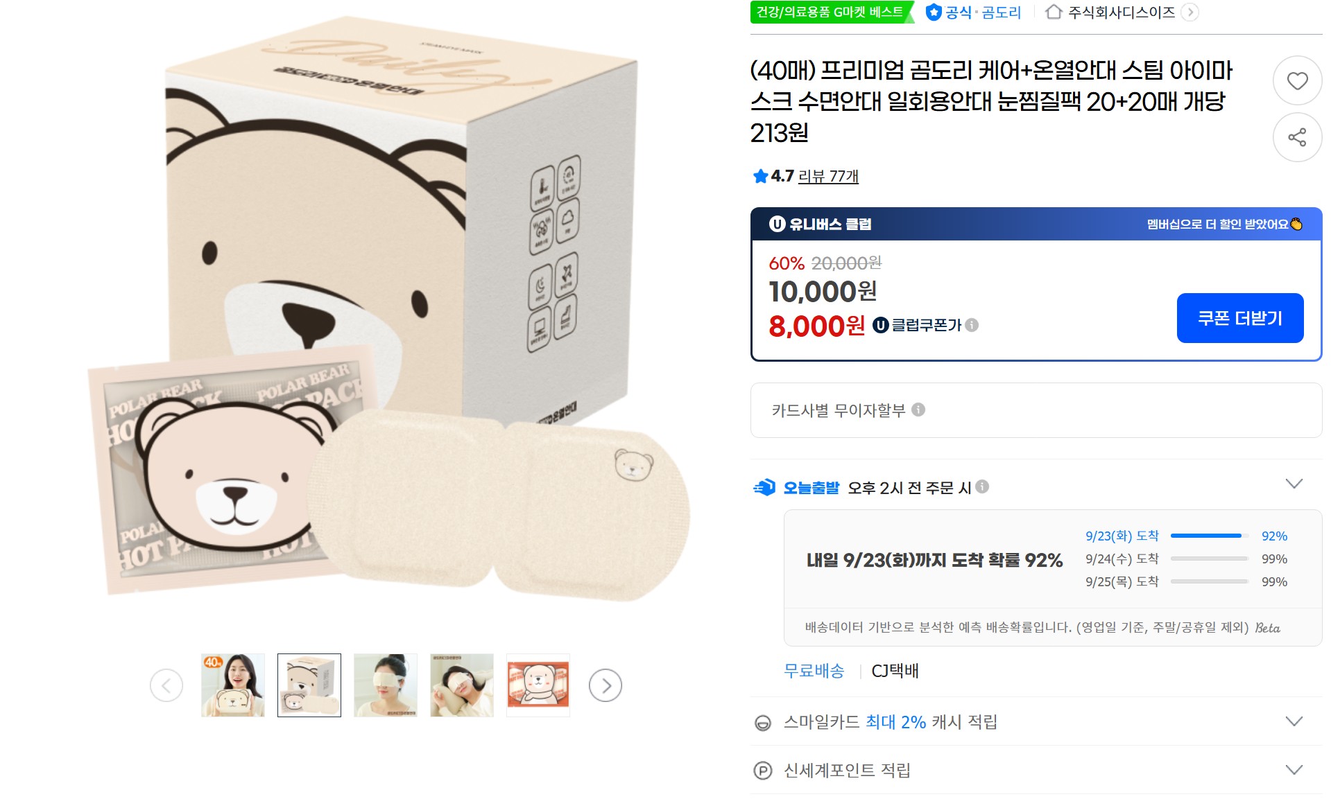 [지마켓] 프리미엄 곰도리 케어+온열안대 40매 (8,000원/무배)