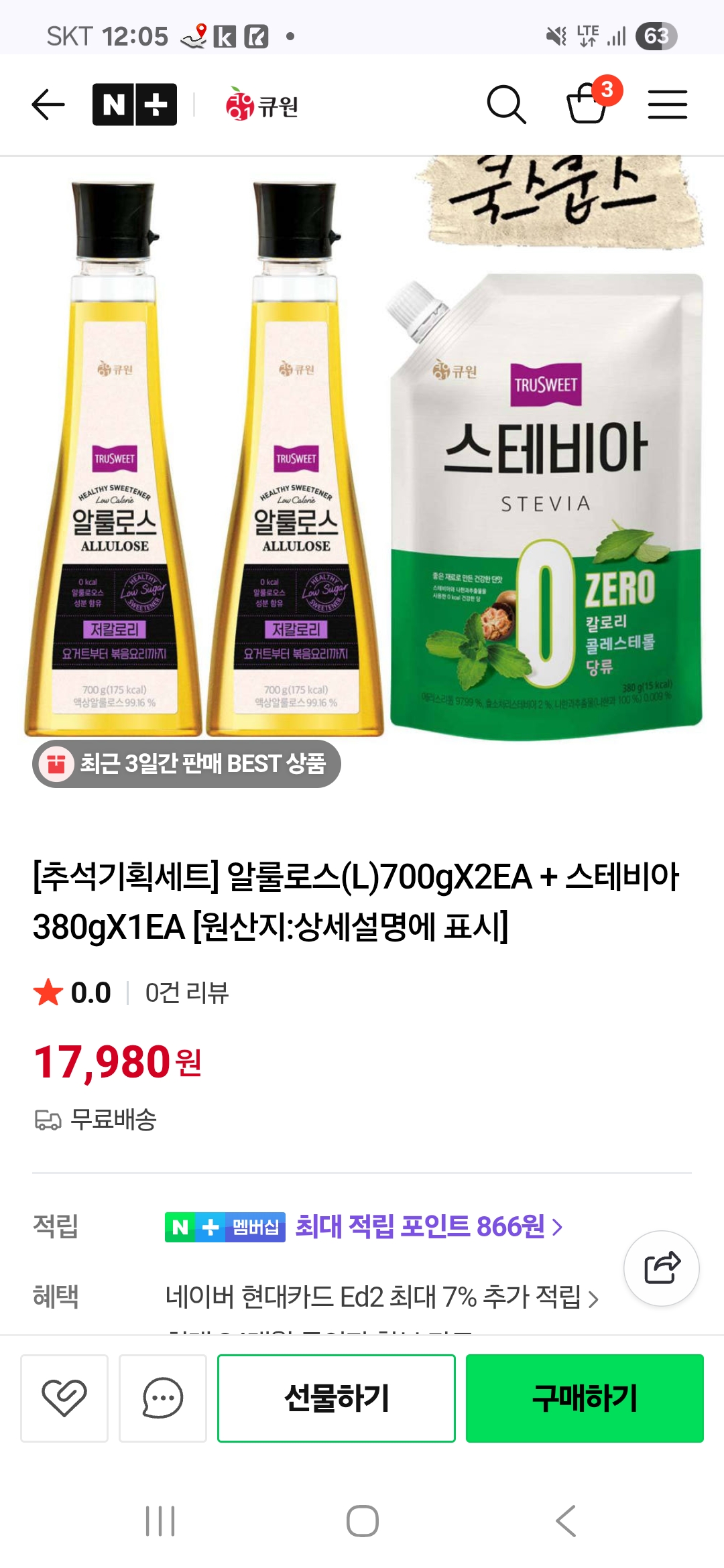 [네이버] 큐원 추석기획 알룰로스 스테비아 세트 (17,980원/무료)