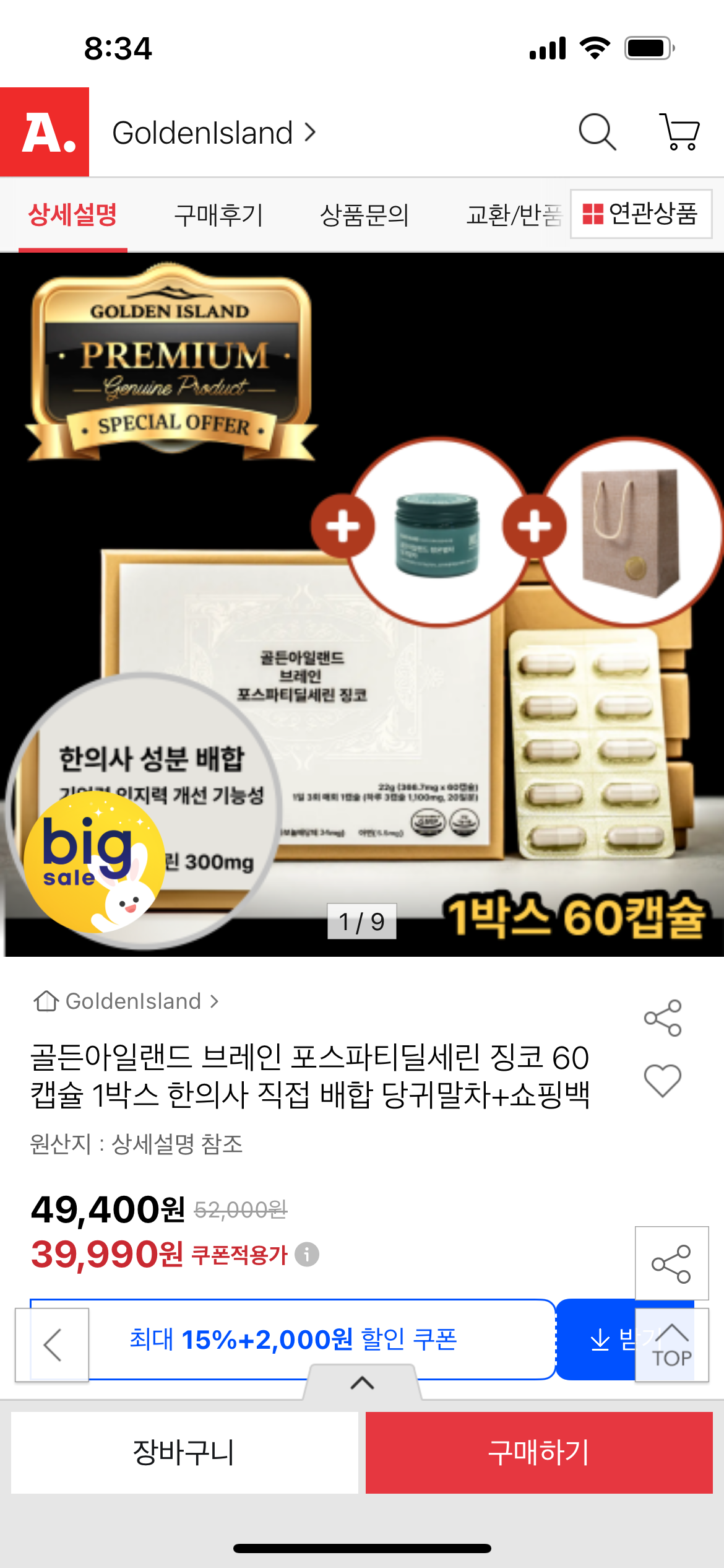 [옥션] 골든아일랜드 브레인 포스파티딜세린 징코 60캡슐 1박스 (39,990원/무료)