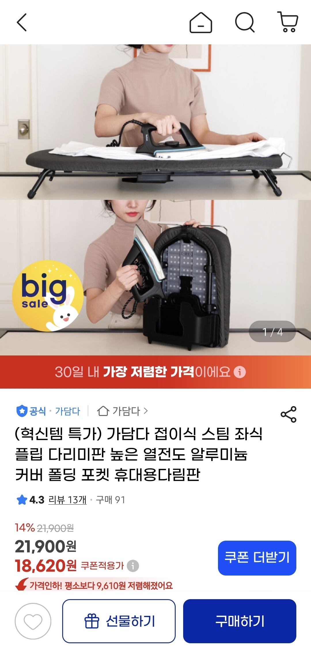 [지마켓] 접이식 플립 다리미판 (18620원/무료)
