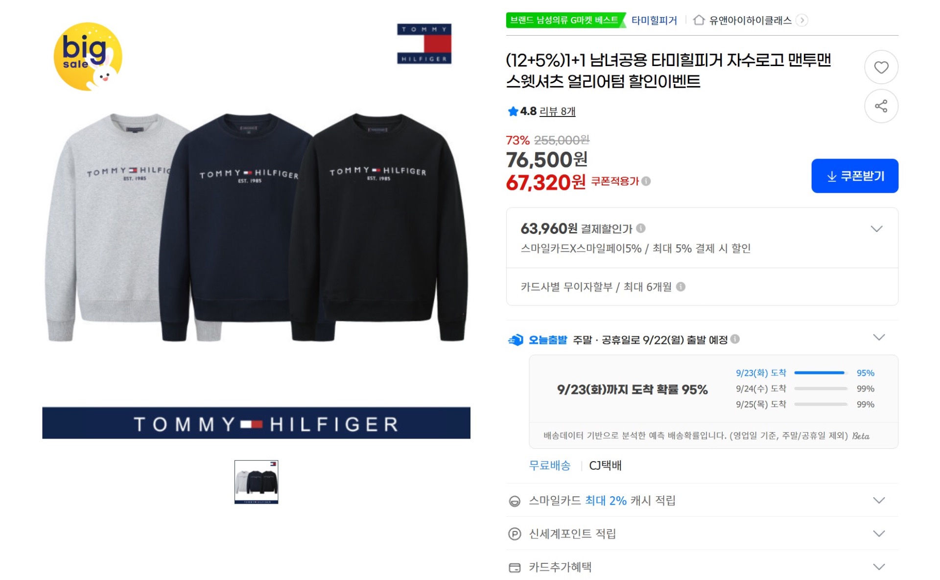 [지마켓] 남녀공용 타미힐피거 자수로고 맨투맨 스웻셔츠 1+1 (63,960원/무배)