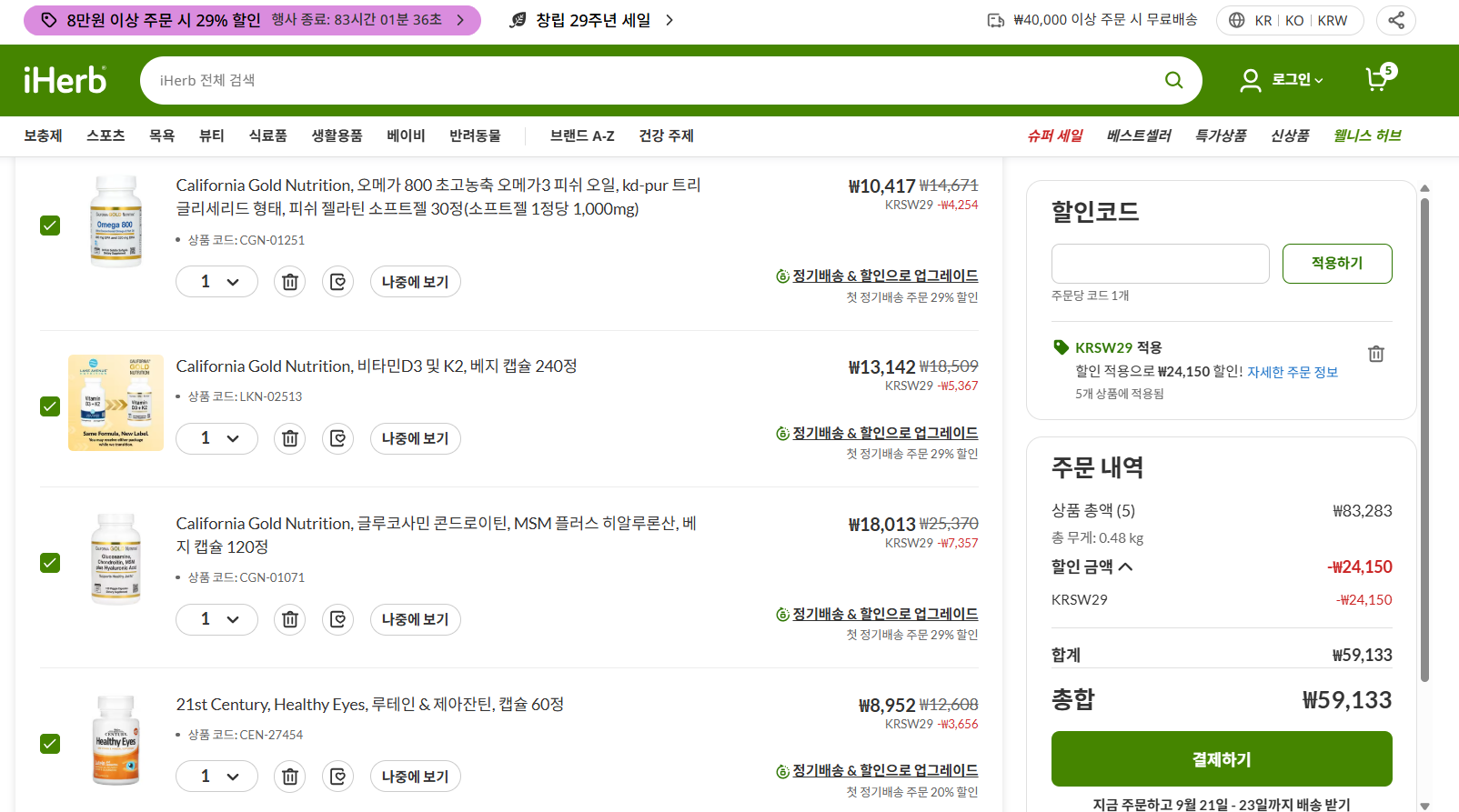 [아이허브] 29% 전상품 할인 (영양제, 종합비타민, 마그네슘 등)