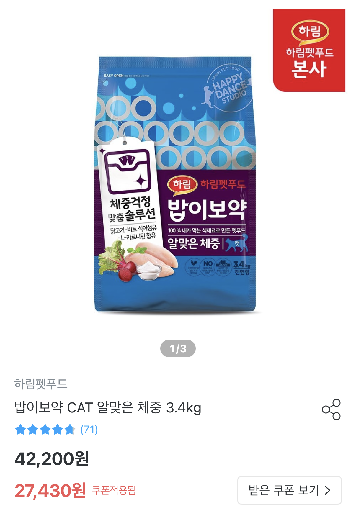 [오늘의집] 하림펫푸드 밥이보약 CAT 알맞은 체중 3.4kg (26,059원/무료)