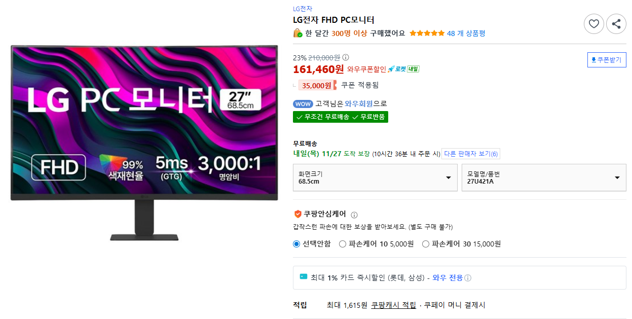 [쿠팡] 엘지 PC모니터 27U421A (161,460원/무료) 댓글1개