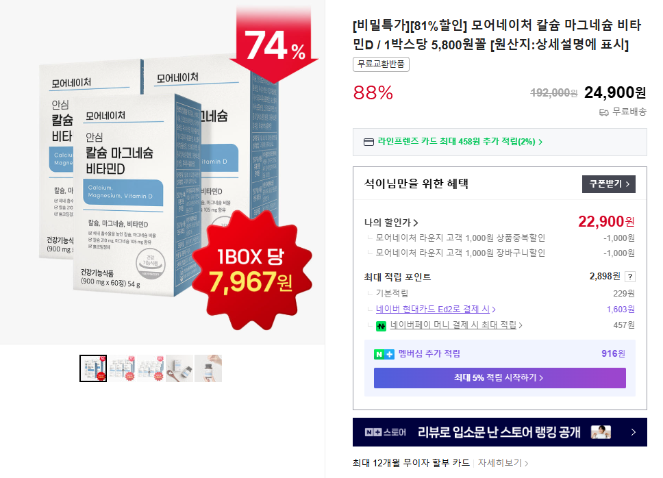 [네이버] 칼슘 마그네슘 비타민D 3박스 22,900원/무배