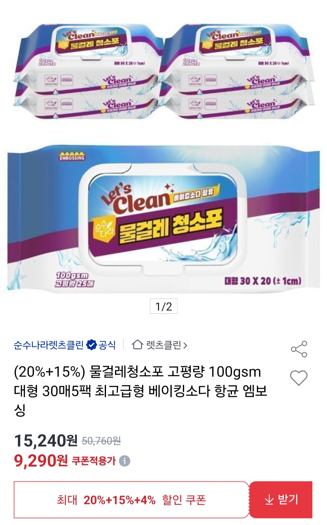 [옥션] 최고급형 물걸레 청소포 고평량 100gsm 대형 5팩 (9,290원/무배)