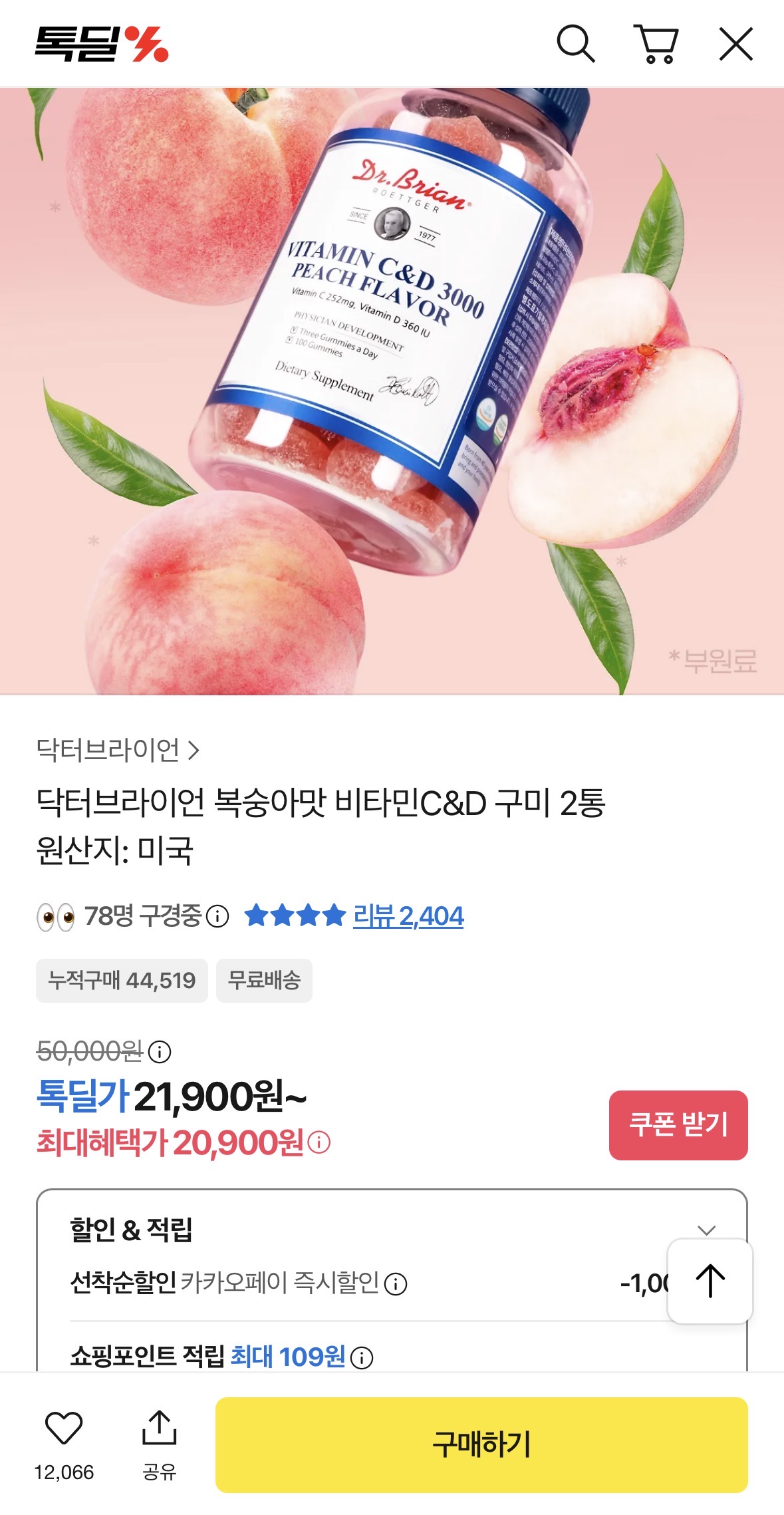 [톡딜] 닥터브라이언 비타민C&D 3000 복숭아맛 100구미 2통 (20,900원/무배) 댓글1개