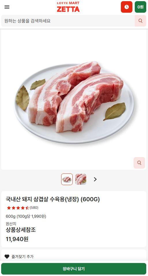 국내산 수육용 삼겹살 600g 11,940원에 할인하네요