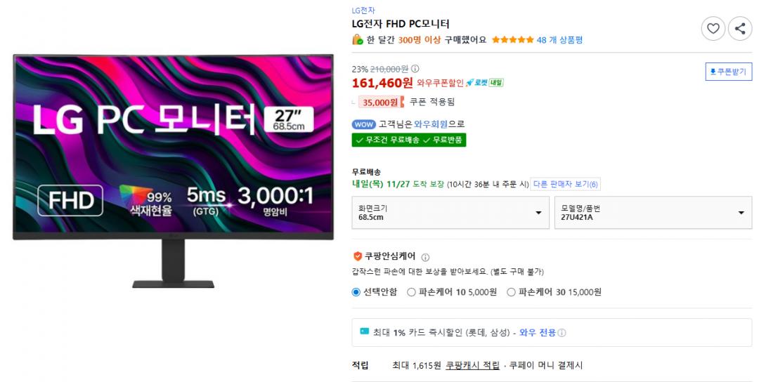 [쿠팡] 엘지 PC모니터 27U421A (161,460원/무료)