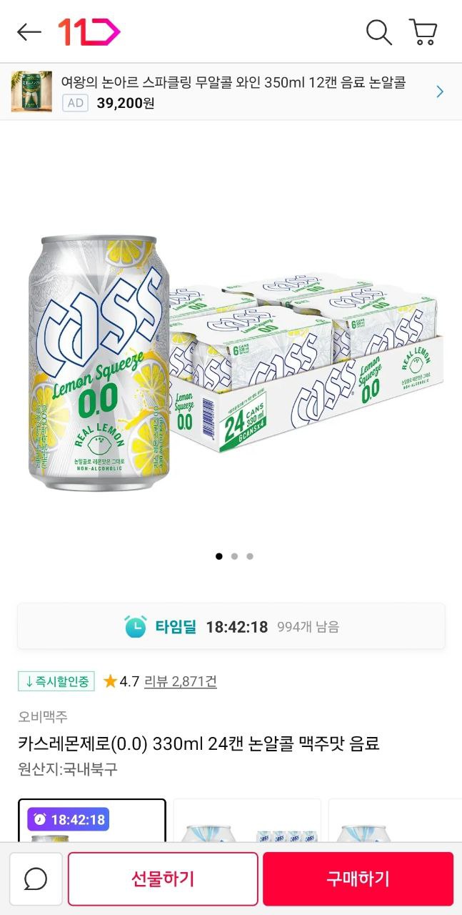 [11번가] 카스레몬제로(0.0) 330ml 24캔 논알콜 (16,320원/무배)