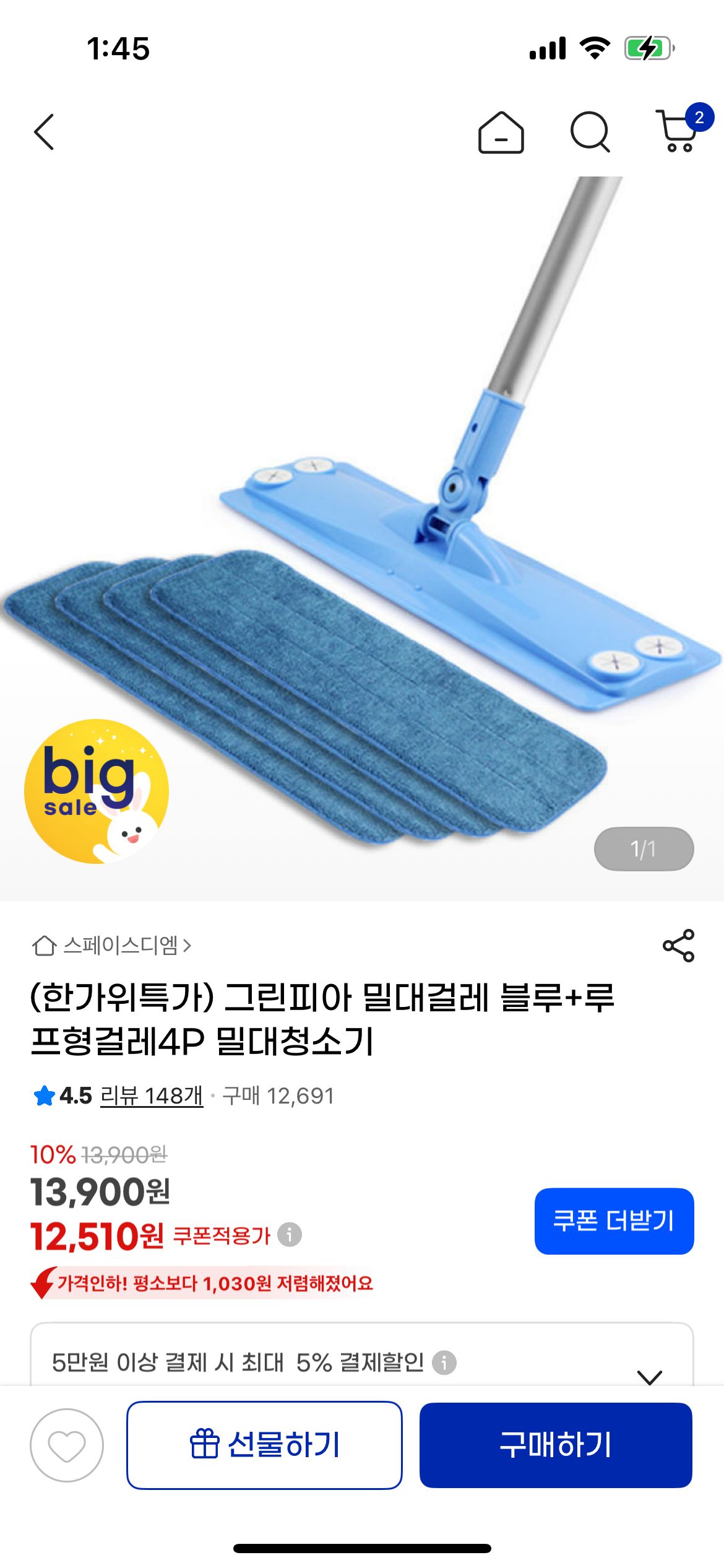 [G마켓] 그린피아 밀대걸레 블루+루프형걸레4P (12,510원/무료)
