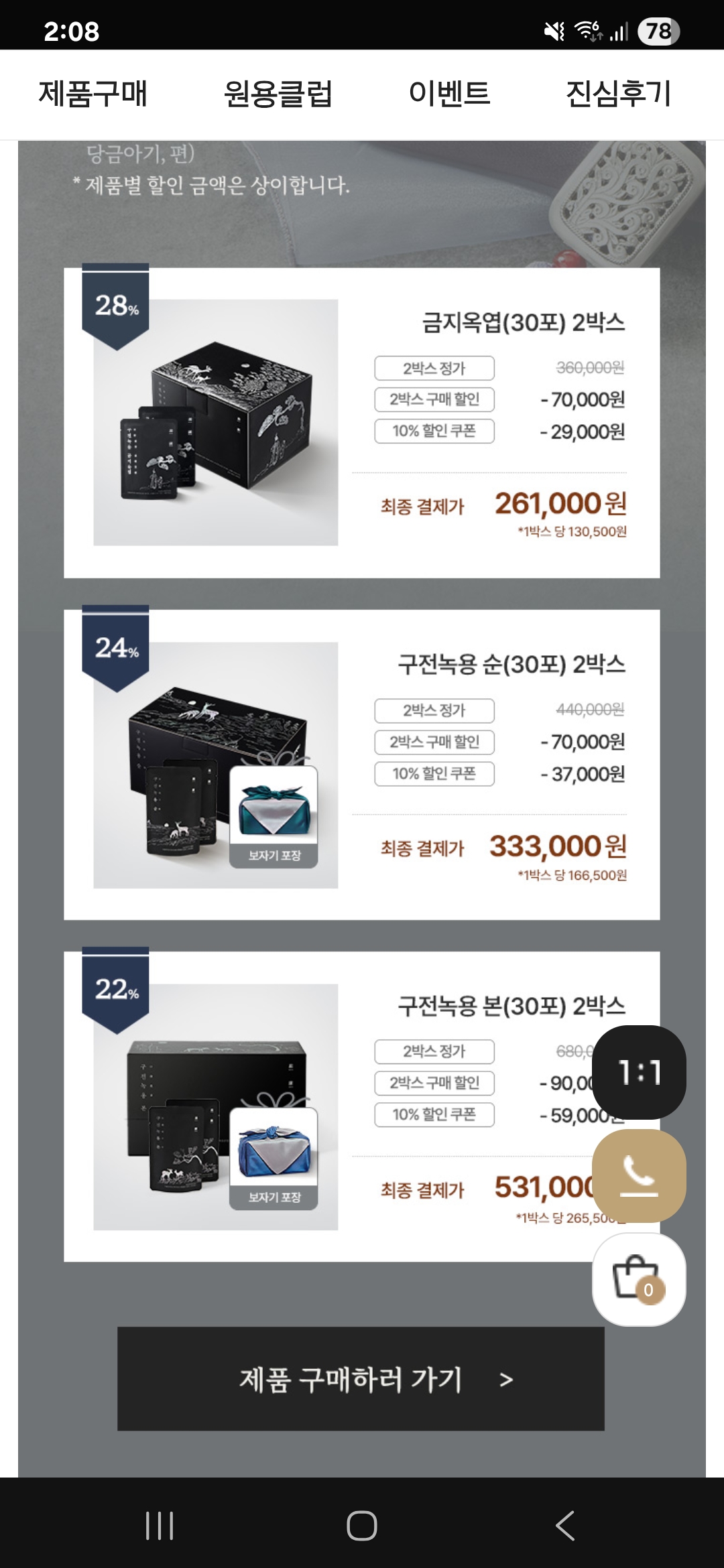 50만원 이상은 13만원에 판매 중인 구전녹용 편 30포 증정이라 괜찮네요.
