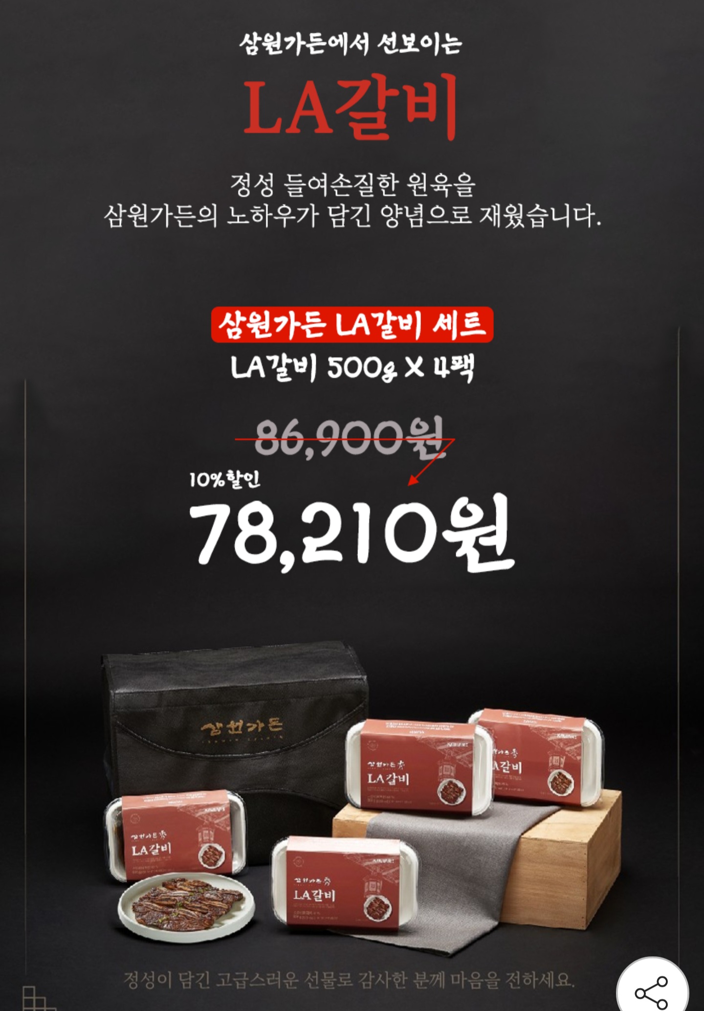 [지마켓] 삼원가든 LA갈비 선물세트 (500g x 4팩) (카드 74,300원/무료)