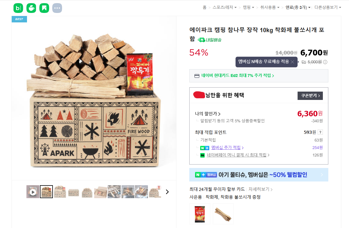 [네이버] 에어파크 캠핑 참나무 장작 10kg (6,360원 / 무료)